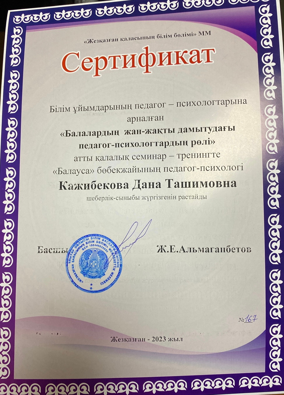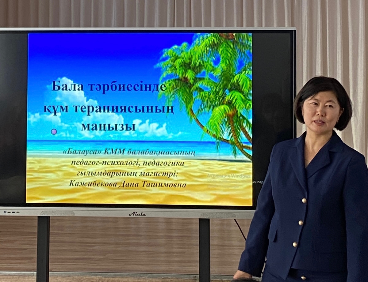 2023 жылы 12 қаңтар күні Жезқазған қаласының білім бөлімі әдістемелік кабинетінің ұйымдастыруымен өткізілген, №8 гимназияның базасында «Балалардың жан-жақты дамытудағы педагог-психологтардың рөлі» атты қалалық семинар – тренингке «Балауса» бөбекжайының педагог-психологі Кажибекова Дана Ташимовна «Бала тәрбиесінде құм терапиясының маңызы» атты тақырыпта шеберлік-сыныбын өткізіп, құм терапиясының маңыздылығы жайлы, құм арқылы балалардың ой-өрісін дамытуға арналған ойын түрлерімен таныстырып, өз тәжірибесімен бөлісті. Семинарда берілген мәліметтер барлық қатысушылардың қызғушылығын оятып, семинар-тренингке қатысқан әр педагог алдадағы уақытта өз тәжірибесінде қолданады деген сенімдеміз.