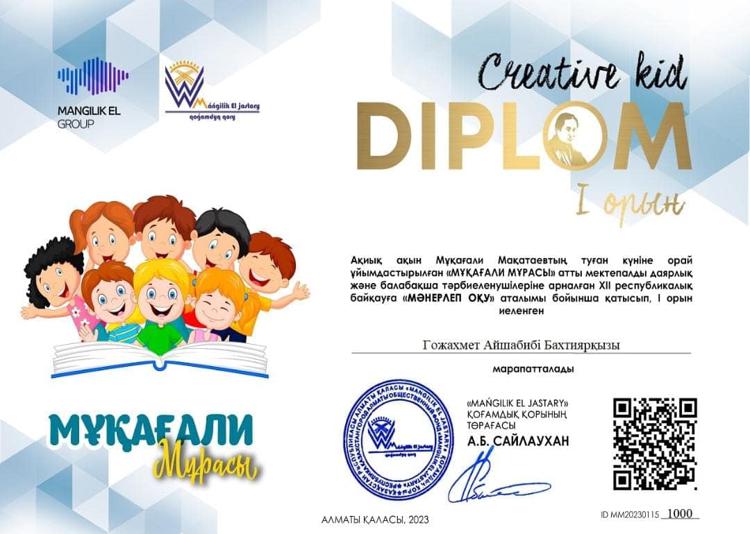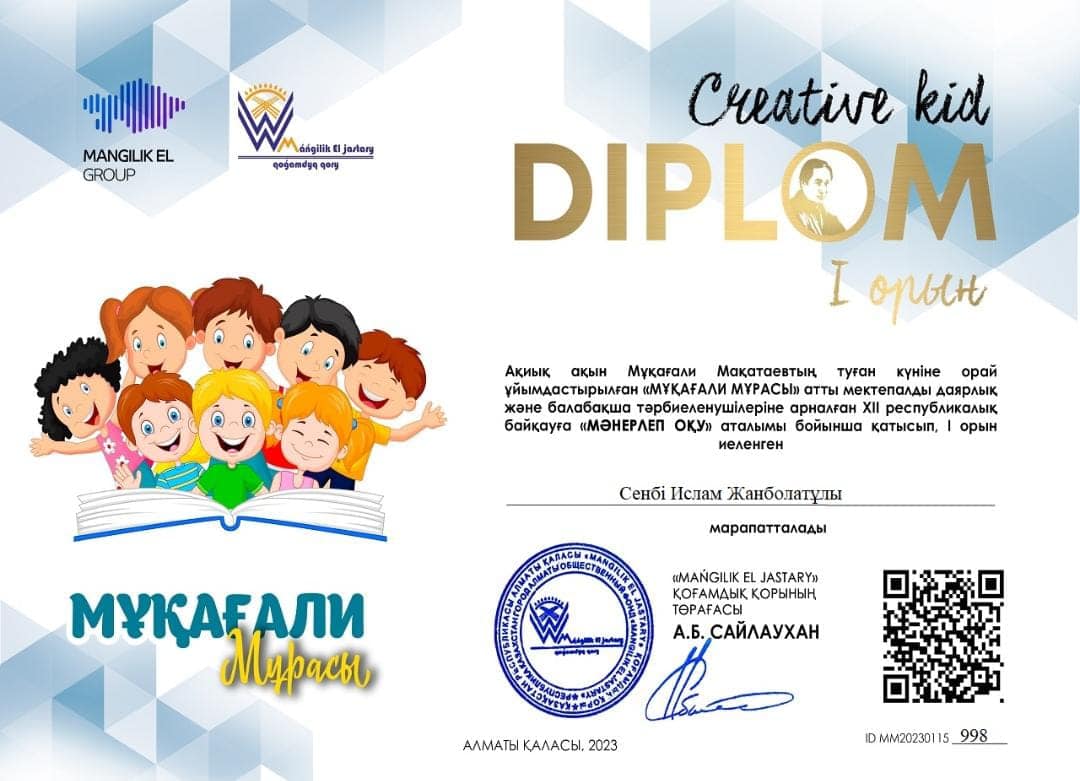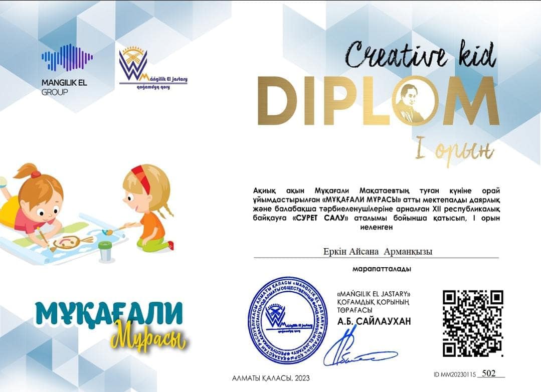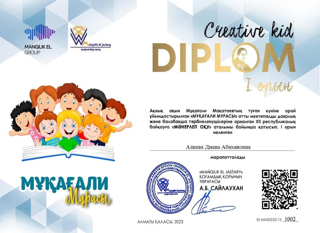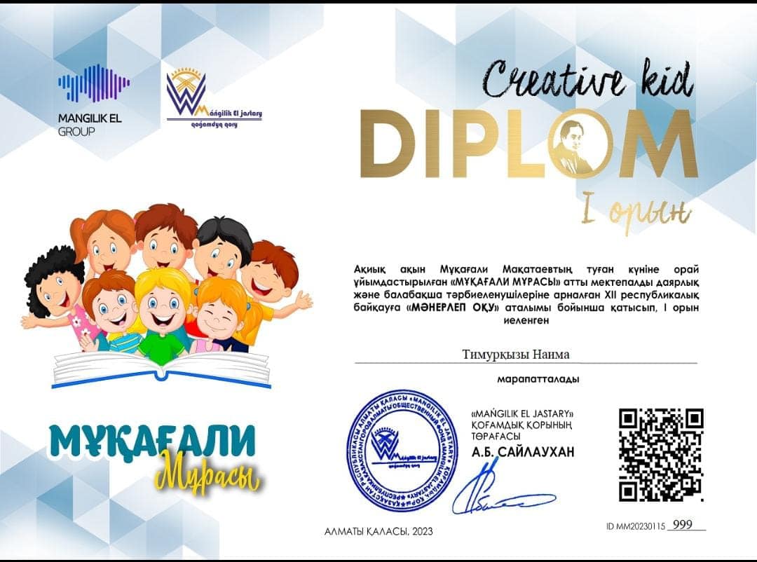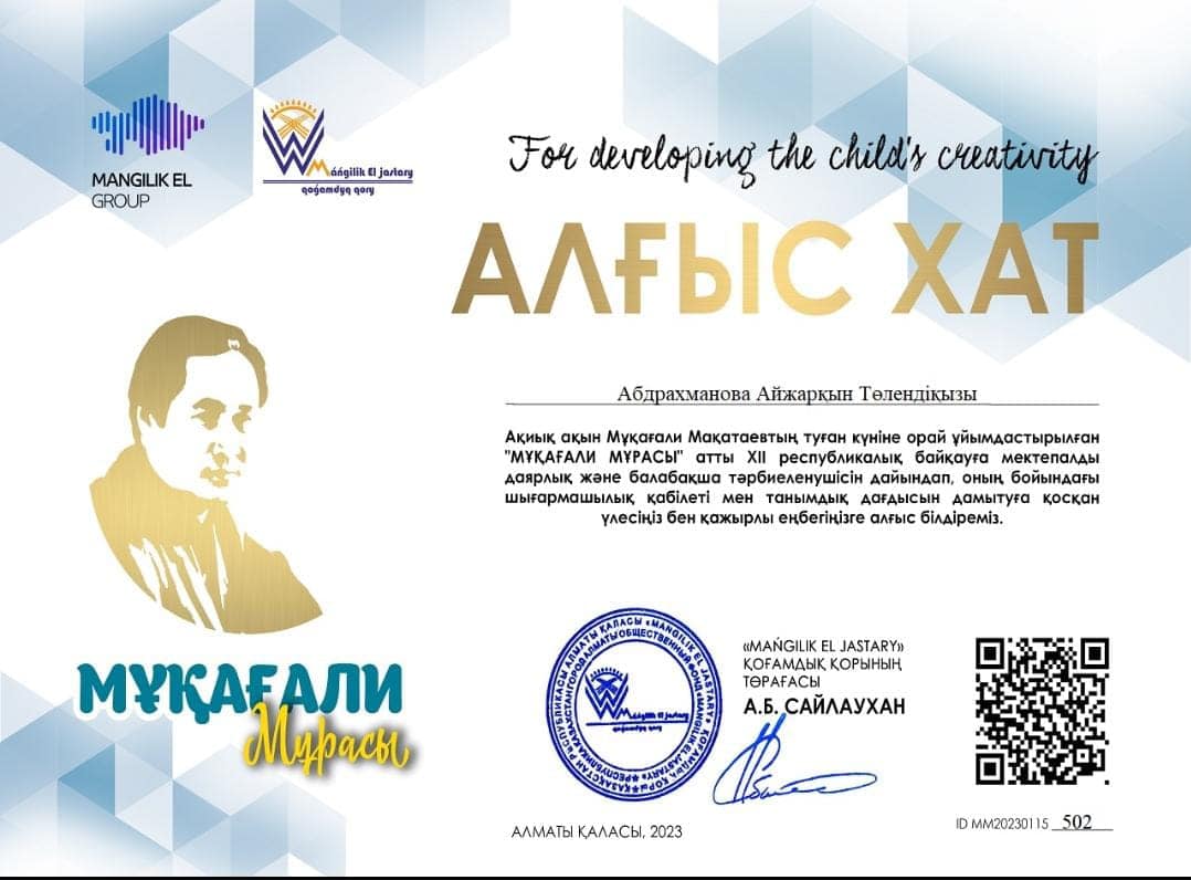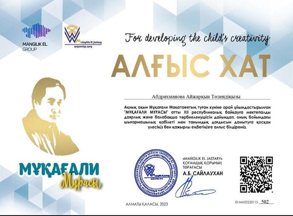 Мұқағали Мұқатаевтың шығармашылығын бүлдіршіндердің арасында насихаттау және өлең оқуға ынтасы мен талабын ашу, көркемдік шеберлікті шыңдау барысында және МҰҚАҒАЛИ МҰҚАТАЕВТЫҢ туған күніне орай ұйымдастырылған "Мұқағали Мұрасы" атты мектепалды даярлық және балабақша тәрбиеленушілеріне арналған Республикалық байқауға "Мәнерлеп оқу" аталымы бойынша Балбөбек"тобының тәрбиеленушілері: Сембі Ислам Жанболатұлы, Алиева Диана Абахановна, Гожахмет Айшабибі Бахтиярқызы, Тимутрқызы Наима, Еркін Айсана Арманқызы қатысып 1 орын иегерлері атанды. Құттықтаймыз Тәрбиешісі:Абдрахманова Айжарқын Төлендіқызы. Әдіскері: Жаменкенова Меруерт Есенбековна.